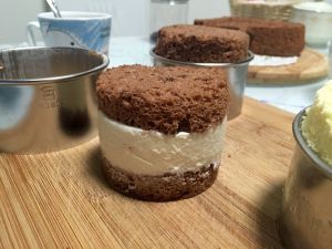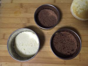 然后用小圆切模,切三个大小不一样的圆柱体。一个八寸的话正好切成三寸,两寸,一寸的。然后横切开,模具底部放好蛋糕片。