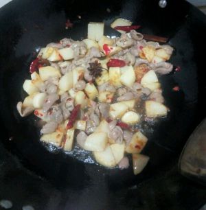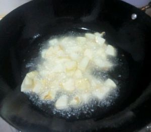 土豆削皮,切成方块。热油炸两分钟,表皮起皱即可。捞起。锅中留一部分油