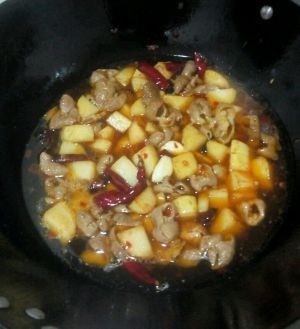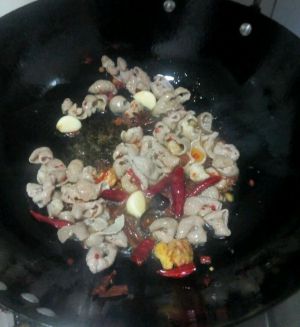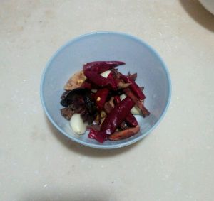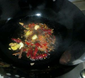 放豆瓣、姜片、蒜瓣、香料、干辣椒,炒香