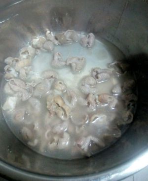 肥肠用盐、面粉等洗净,切大一点的段(缩水严重)。在开水里煮一分钟,捞起。高压锅压10分钟,捞起