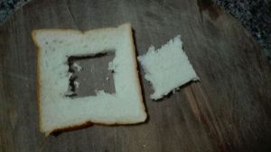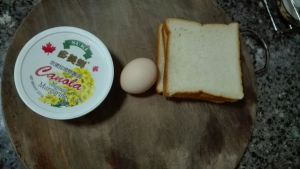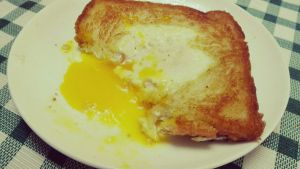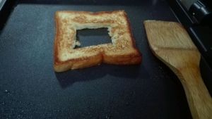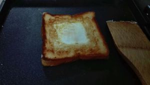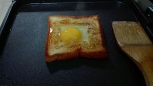 加入鸡蛋,煎至土司能在煎锅自由滑动