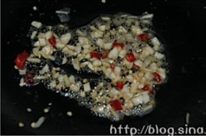 锅中留少许油,下姜蒜末,干辣椒炒香