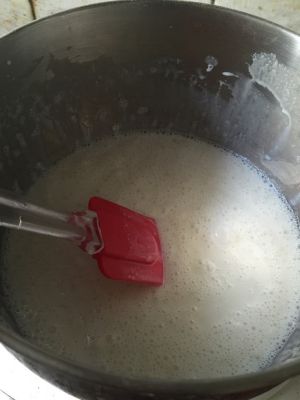 加入糖粉。小火加热至糖粉融化。但不要把牛奶烧开!