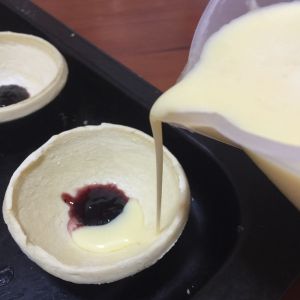 过筛后的蛋挞液倒入蛋挞中。我做的蓝莓的。放的蓝莓果酱。你们也可以放其他味道~