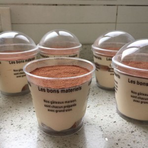 倒入半杯的芝士糊,倒的时候要慢些 防止把手指饼干冲的浮起来