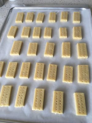 烤箱180度提前预热。将饼干切块,放入烤盘中用叉子在饼干上戳洞。