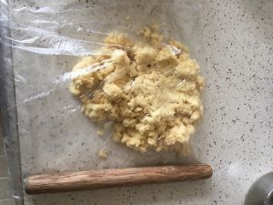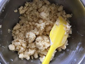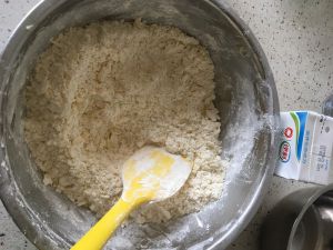 先用刮刀拌一拌,让黄油与面粉混合均匀。然后再用手拌一下,观察混合的程度,如果有点干适量加一点牛奶,(牛奶是一点一点的加入,不要一次性倒很多进去噢。一瓶250毫升牛奶我差不多加了三分之一)变松软一点的面团就可以了。