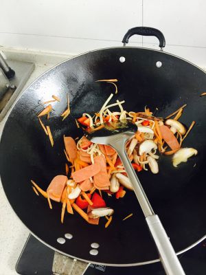 放油,烧热,除了豆腐,鸡蛋,还有淀粉,一起放入炒锅里,稍微炒一会。