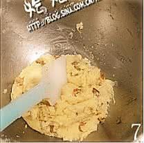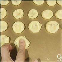 铺上油纸或是锡纸(我的烤盘是防沾的,所以没铺油纸),将圆球面糊放在烤盘上,用手指在圆球面糊中间按一下。预热烤箱至180度,中层,上下火,10分钟左右,香喷的核桃曲奇就出炉了。