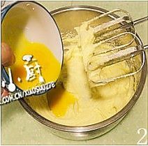用电动打蛋器不断搅打,将黄油打发到体积膨大,颜色稍变浅,分3次加入打散的鸡蛋液,并用打蛋器搅打均匀。每一次都要等黄油和鸡蛋完全融合再加下一次。黄油必须与鸡蛋完全混合,不出现分离的现象。