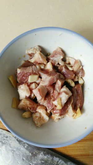 姜切片,蒜压碎,加入生抽,将肉腌制10分钟左右。