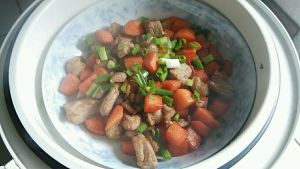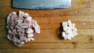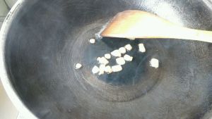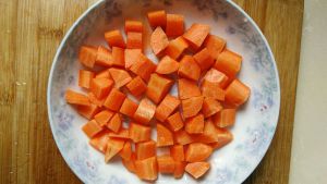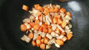 先后加入肉丁和胡萝卜丁爆炒。加入适量盐。
