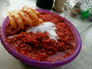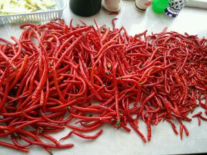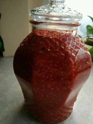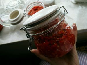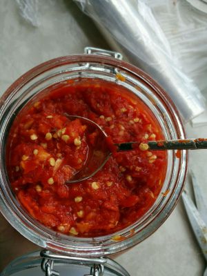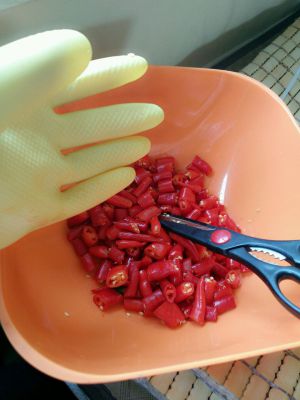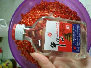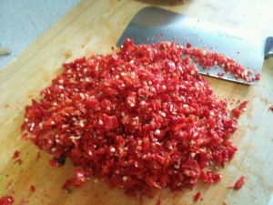 剁椒,可手工可用果汁机搅碎。最好戴厨房防护面具,谨防进眼睛