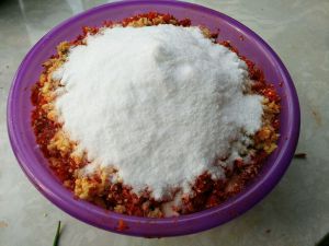 加盐(一斤辣椒2-3两食盐个人口味轻重来)姜蒜搅拌