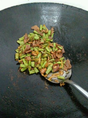 粉丝烫过水备用,豆角用盐水泡上十分钟,洗净折断飞水,用凉水冲洗干净泡沫,然后切碎备用,瘦肉切片放酱油,糖炒香