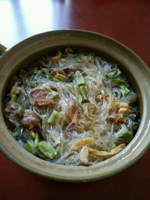 把炒好的料铲到烫过水的粉丝上,搅拌一下,加点水煲,滚开就好了
