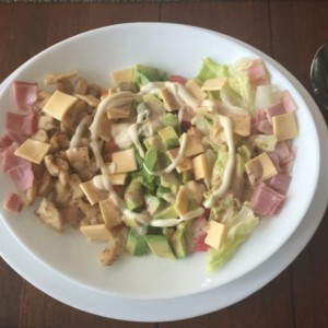 胡萝卜、西红柿切小丁;球生菜撕小块;牛油果去壳去核切小丁;培根煎熟后切小块;烤熟的鸡胸肉,所有食材都竖着摆放在盘中。