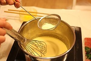 将搅拌好的挞水用滤网过滤,这样可以滤掉打不散的蛋粒和粉粒,烤好的蛋挞表皮才会光滑。注意要在滤网上多搅动几下,直至水份完全滤掉。
