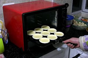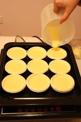 烤盘上摆好挞皮,将滤好的挞水倒入挞皮,八分满即可,因为蛋挞在烤制的过程中会膨胀。