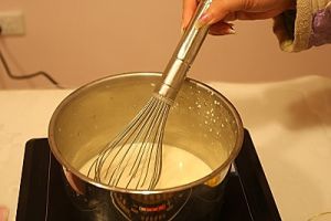 .盆里加入牛奶/淡奶,淡奶油,糖,小火加热,一边加热一边搅动至糖溶化,沸腾前关火,放一边冷却至不烫手就行。