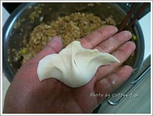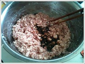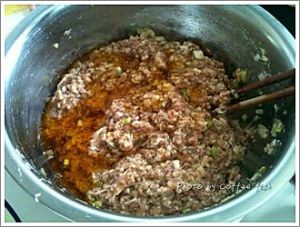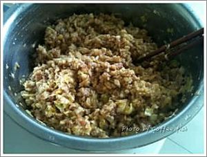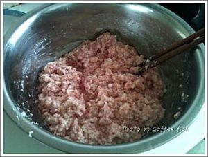 将肉馅加少许水.顺时针搅拌让肉馅吸收水分.