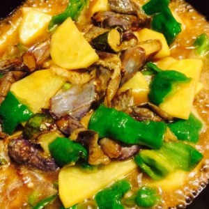 炒锅油炸茄块剩点底油, 倒入土豆翻炒一下。 加半杯水盖锅盖稍焖5-8分钟, 翻炒加入茄块, 辣椒块, 翻炒, 入生抽, 蚝油, 块翻炒。 Viola, 色香味的三鲜出锅了!