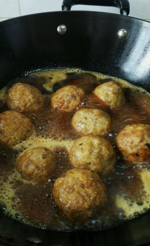 加入刚才调好的红烧汁,烧滚,放入肉丸,,,
