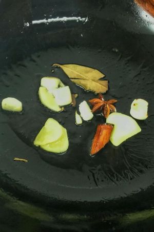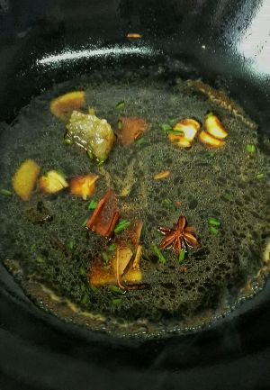 油锅下少量油,姜,蒜,八角,桂皮,香叶炒香,,,