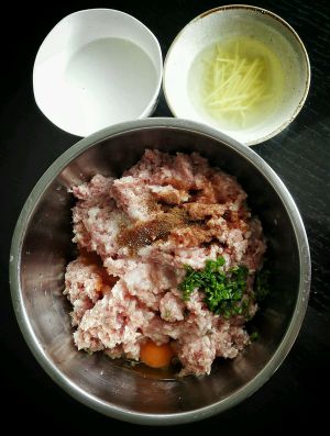 肉馅里放鸡蛋,黄酒(黄酒要少,不放也可),盐,生抽,葱花,五香粉顺时针打上劲,期间加入水淀粉和姜汁水,不停搅拌哦,累了可以叫家人帮忙,不然丸子不嫩哦,,呵呵,,,