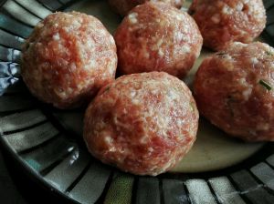 打好的肉做成丸子,我是双手反复摔,然后搓圆,大小可以按自己喜好来,我是做成草鸡蛋大小,哈哈,大的吃起来爽,,,