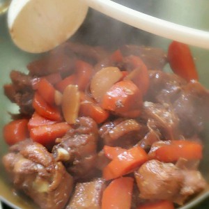 锅里放油,爆香葱姜蒜,然后翻炒胡萝卜,再倒入鸭腿炒一会。然后倒入料酒,酱油,蚝油。不要加水,倒大量的古越龙山花雕酒,一直炖煮,收干汤。这样做的鸭腿不油腻,不腥。
