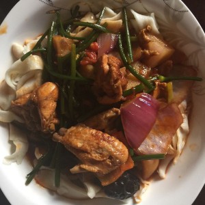 炒匀番茄酱直接把焖烧锅里的鸡块来汤一起倒入炒锅,加盐煮2分钟出锅,直接倒在准备好的抻面上。