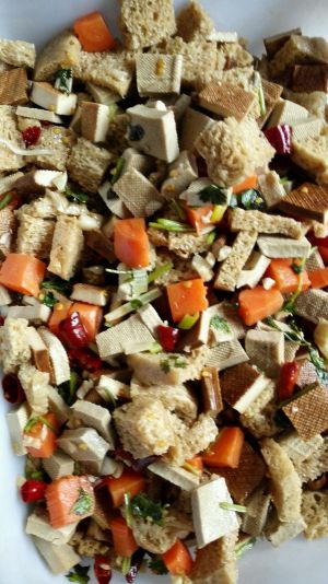 将胡萝卜丁,黑白豆干块,面筋丁,拌匀。