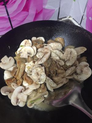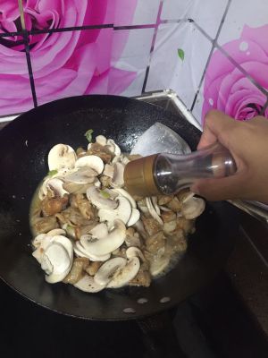 放入口蘑,拧一些黑胡椒碎上去,黑胡椒有些辣,看个人口味添加,我们俩都喜欢吃辣的,又很喜欢黑胡椒的味道,当然多拧一些啦