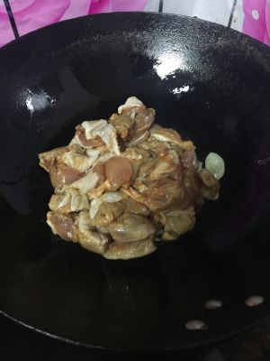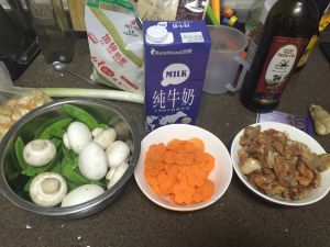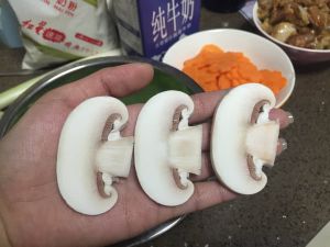 所有材料,胡萝卜用樱花和桃心的模具切花刀,正大的那种腌制好的奥尔良鸡腿排三块就好,切小块,口蘑切片。