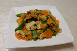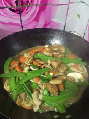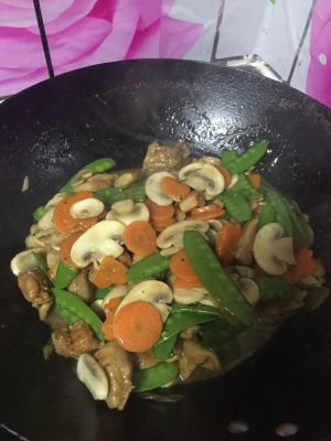 加一点点水,放入胡萝卜和荷兰豆炒一炒,加一点点酱油,一点点盐