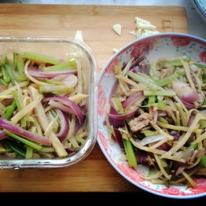 准备好所需材料,土豆洋葱切丝,芹菜切段,葱姜蒜适量