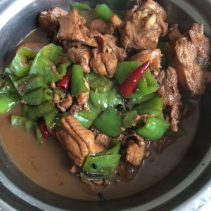 锅内加入适量花椒和花生油,待花椒变黑放入葱姜爆锅,加入鸡腿快速翻炒。鸡肉变色后倒入适量老抽或者黄豆酱油,继续翻炒