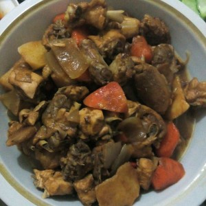 4、炒锅重新热油,爆小米辣,花椒,洋葱,等出香味时加入土豆胡萝卜翻炒至土豆胡萝卜表面脱水(也就是看上去皱巴巴的)时,加入鸡块,加老抽,生抽,盐,糖调味,加水半碗焖至土豆胡萝卜软烂就可以出锅了。