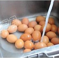 冲至手能忍受鸡蛋温度了立刻开始敲鸡蛋,一定要趁热敲碎。