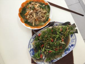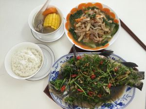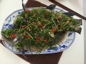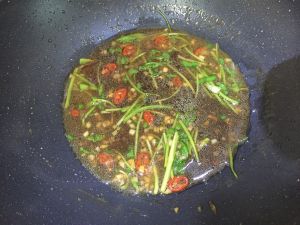 加适量酱油、蚝油,再将蒸好的鱼汤倒入锅里热,然后加入葱花、蒜叶花、红辣椒、香菜,加少许鸡粉、盐