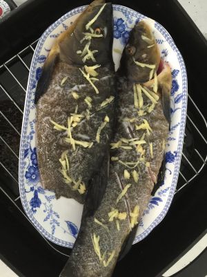 将丁桂鱼洗净后撒上姜丝,放入锅中蒸13分钟