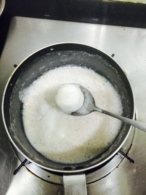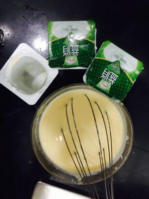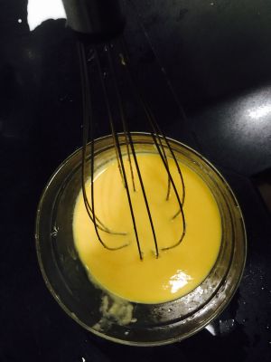 打好的蛋黄液加入奶锅与己溶化在牛奶中棉花糖一起搅拌。