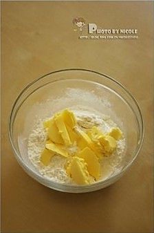 低筋面粉过筛后,加入帕米森奶酪粉、细砂糖和无盐奶油;