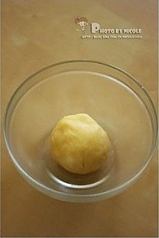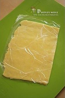 将面团放在保鲜膜上,先用手将面团推成长方形,再用擀面杖擀成长厚约0.2cm的片状,冷藏2小时左右待凝固;