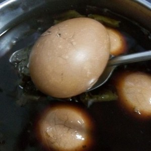 捞出,过凉水,待不烫手时讲鸡蛋敲碎