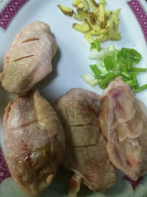 鸡翅洗净,横切两刀,小葱姜片切好备用