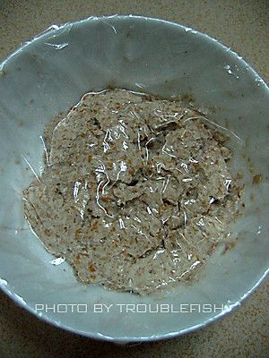 浸发全麦粉:将全麦面粉同等份量的水(中种面团中44g水)和全麦面粉稍微搅拌(不要过度搅拌而让面粉出筋),放置冰箱过夜。为了防止干燥,要用保鲜膜紧贴着面糊,容器外再包一层保鲜膜。