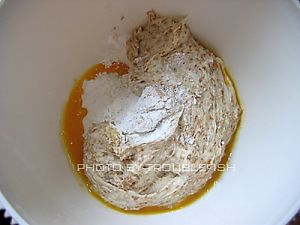 中种面团:浸泡好的全麦粉提前取出放室内回温。将所有材料(包括浸泡一天的全麦粉)用手拌成团就可以,不需搅拌过久。将揉好的中种面团放在盆里用保鲜膜盖好,室温发酵约3~4倍大。(没时间等待可以先在25~28度下发酵至2倍大,再放进冰箱冷藏发酵24小时)