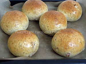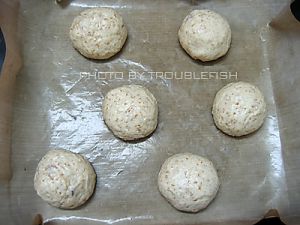 发酵完成后,分成65克/份共6个,滚圆进行最后发酵:当面团膨胀至1.5倍大,可以用手指在面包不起眼的地方轻轻按压,如面团在按压之后会慢慢恢复原状,便表示最后发酵已完成。